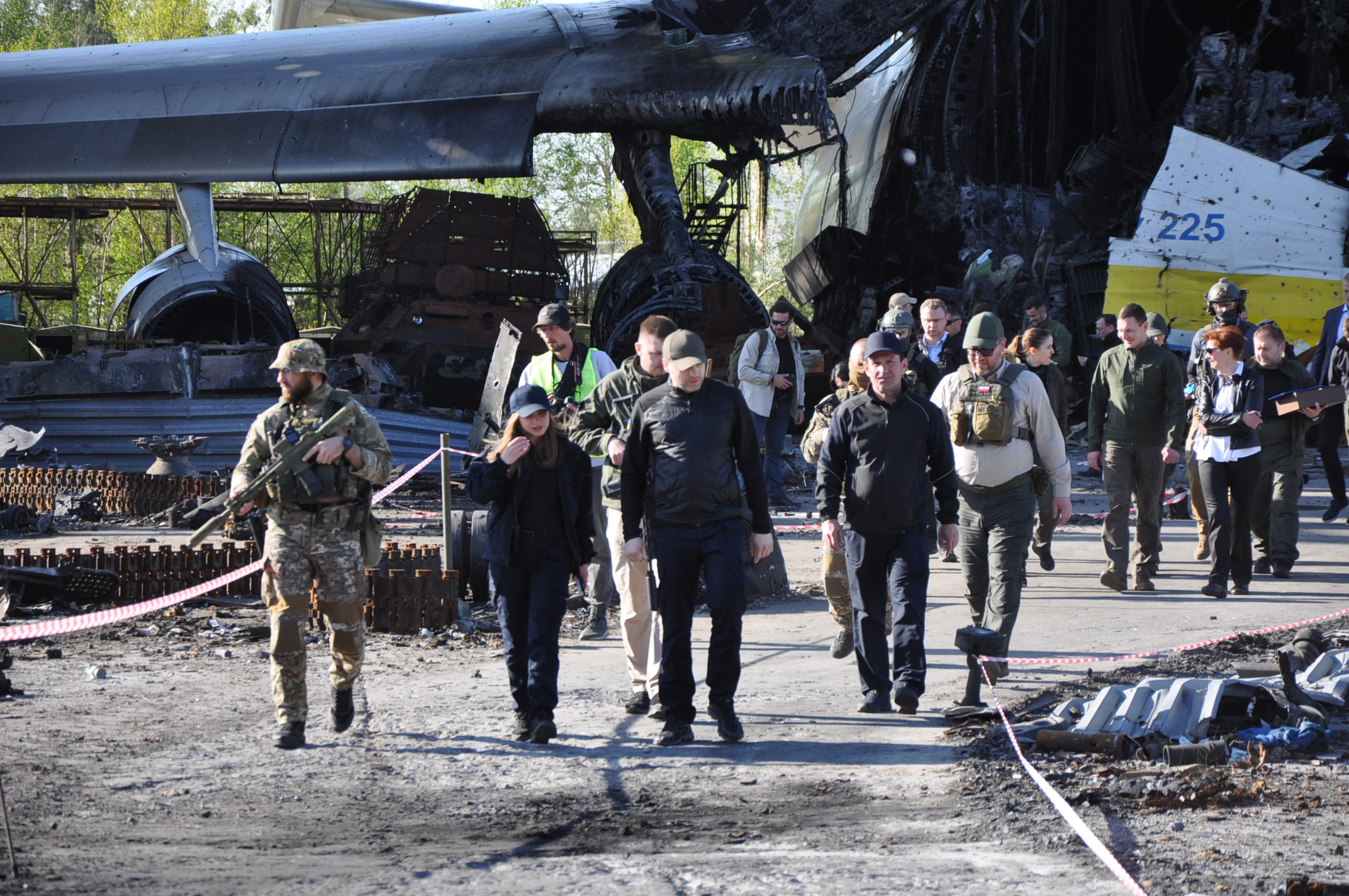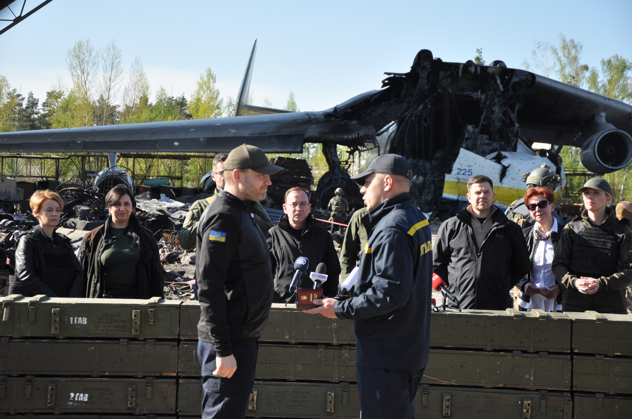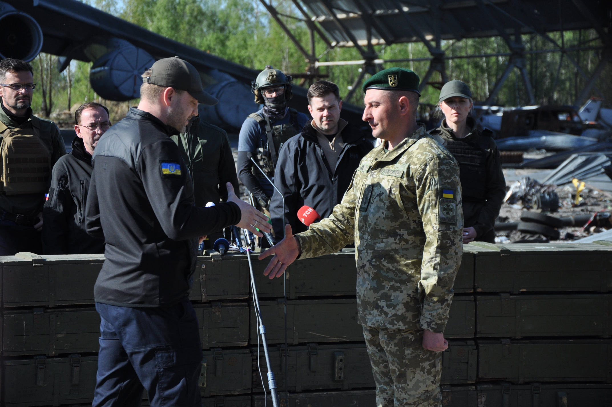 The Ministers inspected the consequences of the destruction of the Hostomel airport, the destroyed "Mriya", and talked to the National Guard fighters who had repelled the enemy attack on the first day of the Russian aggression.