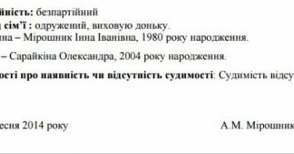 It is likely that Miroshnyk owes his career and former MP status to his brother-in-law. Before marrying her he was an ordinary manager at DataGroup, headed by his brother-in-law, and then rose to director of the department of fixed-lines and, subsequently, Samopomich MP.