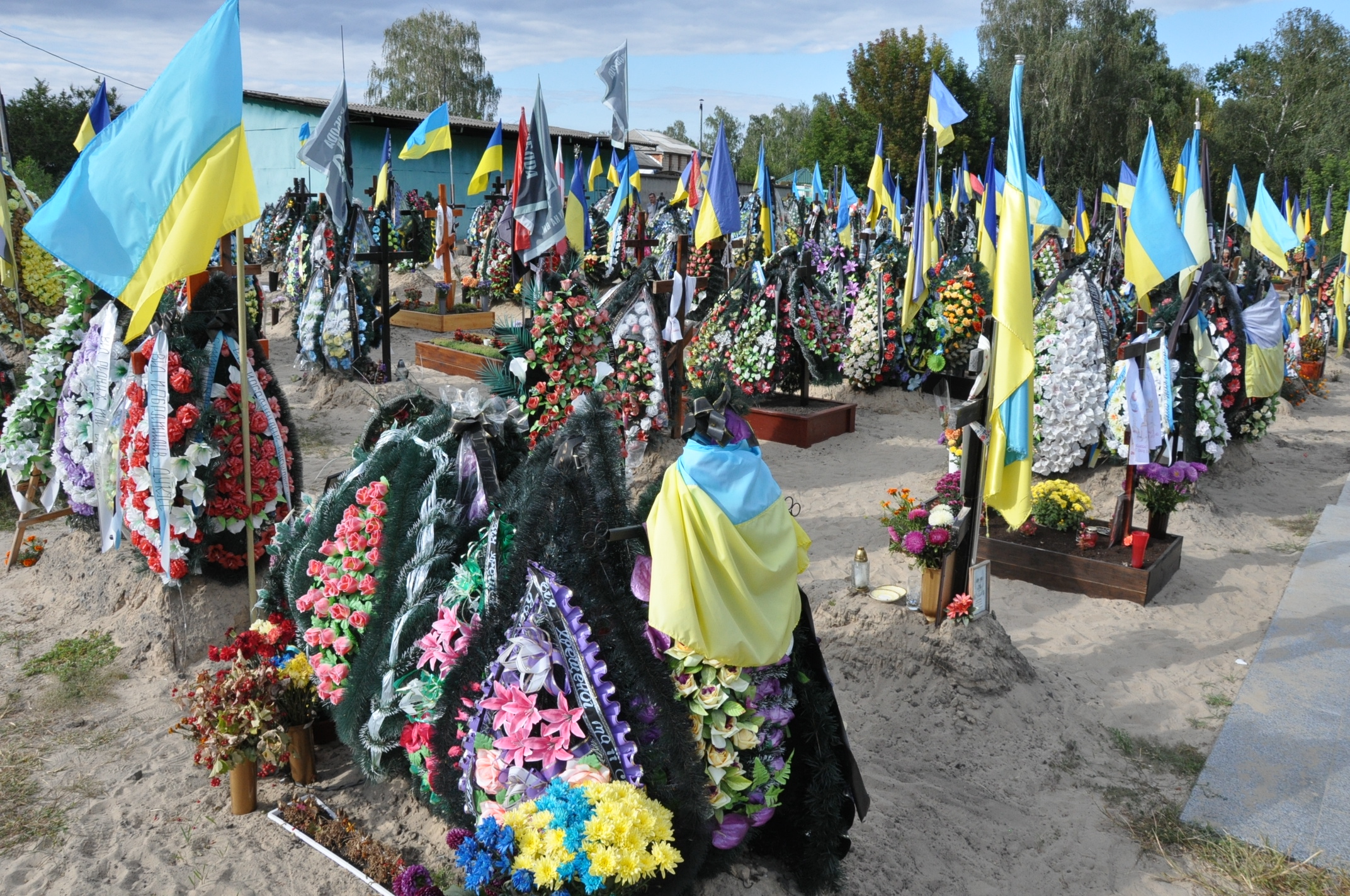 In Kiev, there are numerous rows of graves with Ukrainian flags waving above them in the Lysove Cemetery on Heroes’ Alley.
