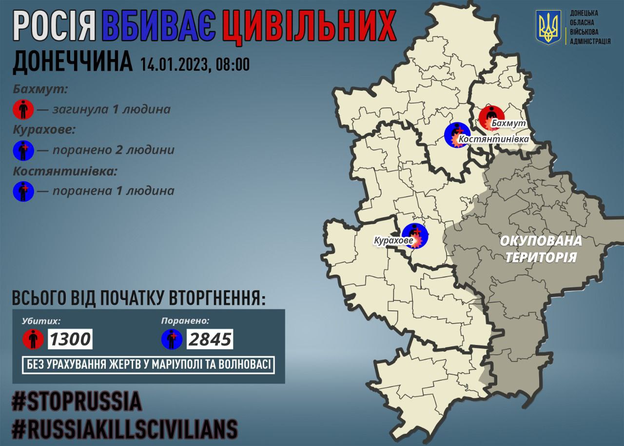 "On January 13, the Russians killed 1 civilian resident in the Donetsk region - in Bakhmut. 3 more people were injured in the region," the report says.