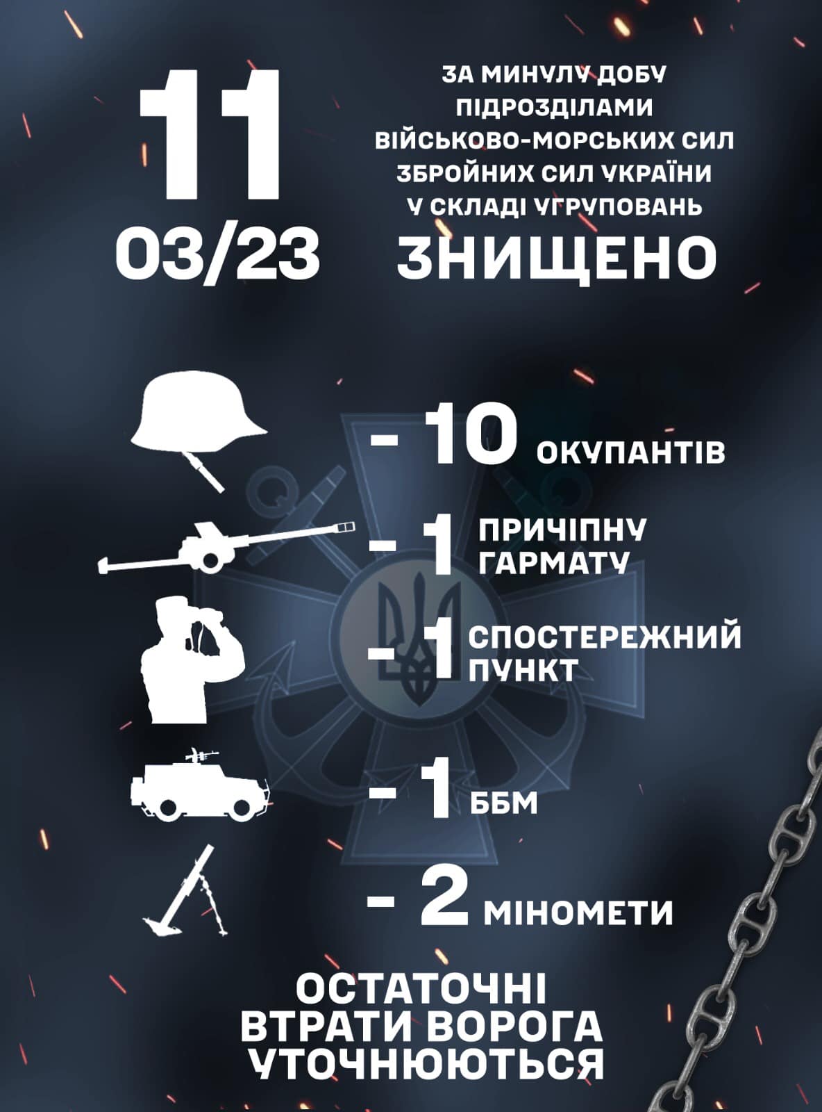 As noted, last day, units of the Navy of the Armed Forces of Ukraine destroyed 10 invaders, 1 towed gun, 1 observation post, 1 armored combat vehicle, and 2 mortars.