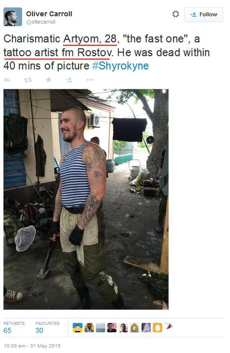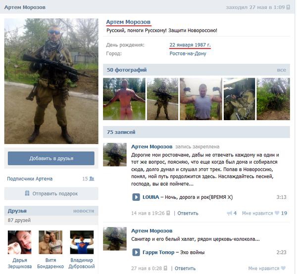 "... He was fighting in Ukraine as a so-called mercenary since December 2014. During his seven-months volunteer service, he realized two things: that there is God in heaven and that the war in Donbas is pointless. And more: he, civilians and his fellow fighters are just "cannon meat" for politicians. Upon feeling this in his soul, he decided that it was time to return home. He no longer felt that he was taking up arms and killing the enemy for the sake of defenseless brothers by blood. Three days later Artem returned home in a coffin. This was his last fight, a fight in which his cold, torn body was defended by his countrymen. It came from experience: Artem, as well as other Russians killed there, were only buried in mass graves. Help, however, came from friends and bribes. At the Bataysk city morgue, his friends fought to delay burial until the next day's evening. That evening the body was dressed and driven across the border with Russia and into the city of Novoazovsk," the author wrote.