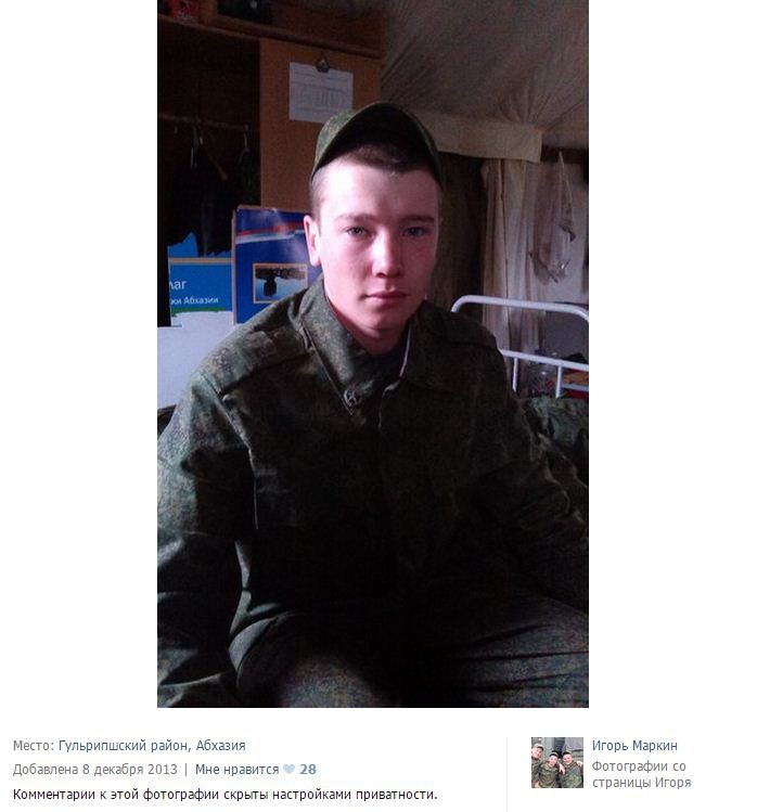 "Judging by Markin's profile in 2012-2013 he served in the 50th operative purposes brigade of the Russian Interior Troops. Since late 2013 he has been a contract soldier of the Russian 7th occupation base in Gudauta (Abkhazia, Georgia) Southern Military District.