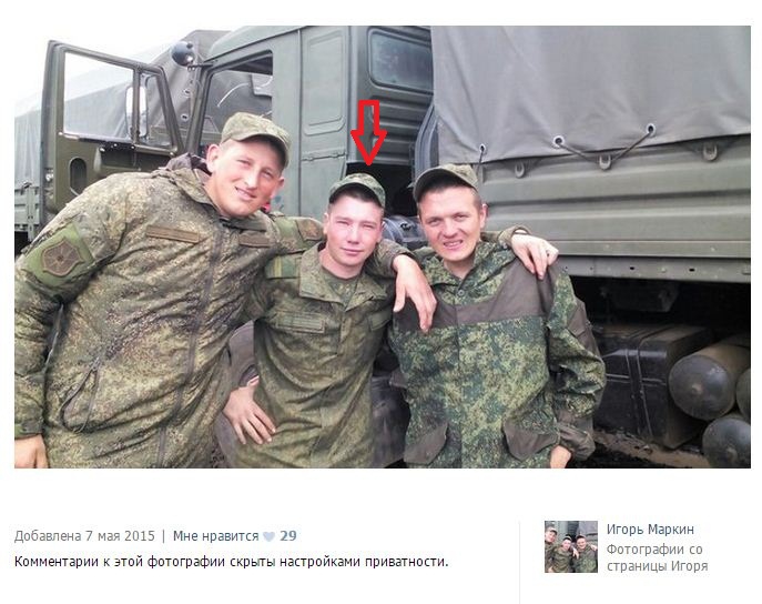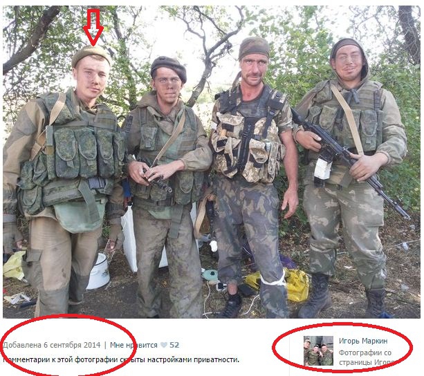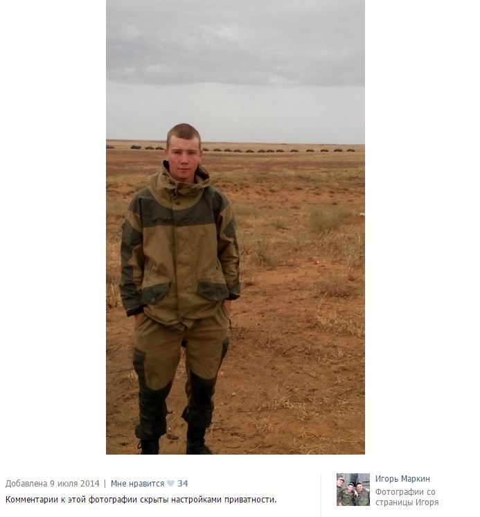 "In spring - early summer of 2014, as part of a battalion tactical group of the 7th base he underwent a pre-Ukraine training at Ashuluk range in the Astrakhan region, from where the division was redeployed to the Donbas, as evidenced by the group photo made in September 2014 posted on Markin's page, where Russian soldiers are trying to masquerade as militants and are overdoing it.