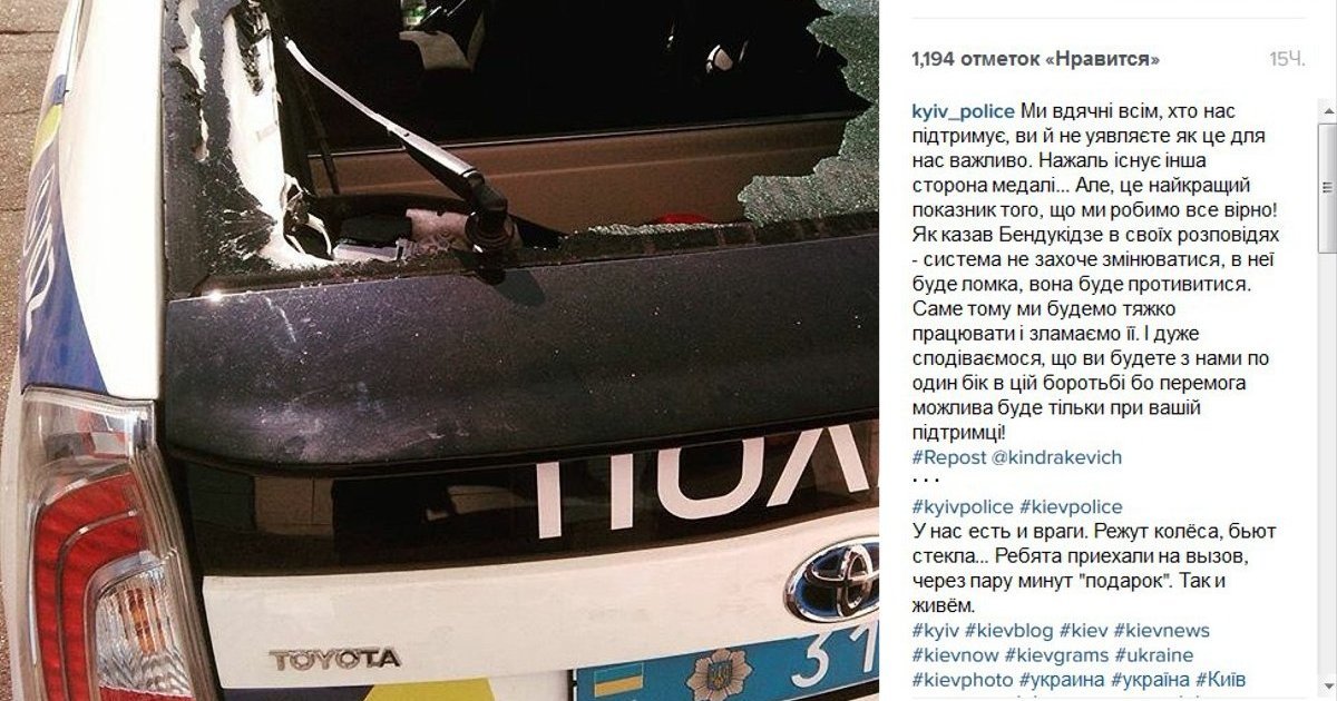 "We've got enemies. They cut tyres and smash windows... The guys came on call and got a "present" in several minutes. This is how we work," a policeman Mykhailo Kindrakevych wrote.