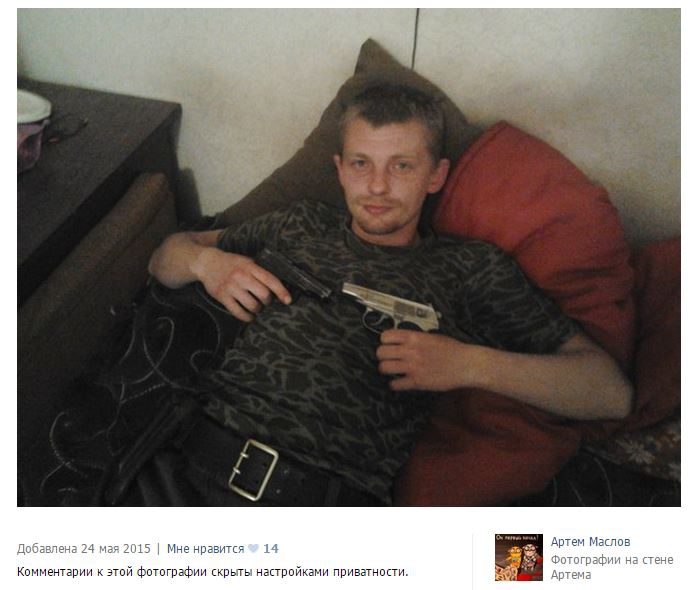 - A picture of himself taken in winter in front of the latest Russian combined short to medium range surface-to-air missile and anti-aircraft artillery weapon system 96K6 ' Pantsir-S1′ (NATO reporting name SA-22 Greyhound), uploaded on July 26, 2015. Taking into account the landscape, we can assume this is not the "Russia Arms Expo 2015" or some military exposition in the Middle East. It seems that Maslov couldn't have missed a chance to shot a piece of the technology art.