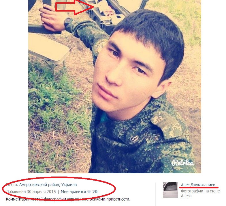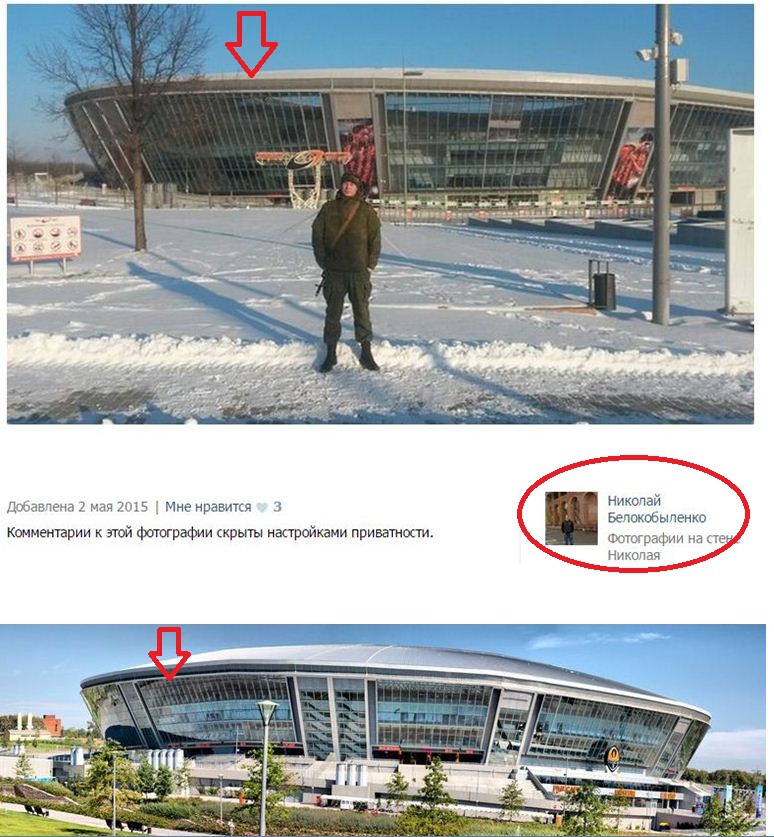 After assembly, the STC transfers the 'Orlan-10' drones to the Russian military, who in turn transfer them into the hands of the "brave soldiers of the Russian world", such as Aleks Dzhumagaliev, Ruslan Galimov and Nikolai Belokopytenko, who are active participants in the Russian invasion of Donbas (as evidenced by photos from their social network accounts)Here, for example, is a photo of a serviceman of the drone company of the 19th motorized rifle brigade (military unit No. 20634, Vladikavkaz, North Ossetia-Alaniya, Russia), senior 'Orlan-10' drone operator, graduate of the Training center for specialists of drone aircraft complexes (in Kolomna), Nikolai Belokopytenko. He is standing, armed, in front of the "Donbas Arena" stadium in Donetsk, Ukraine.