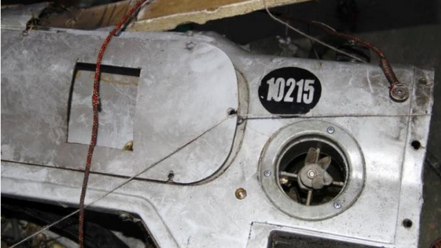 Part of the glider of an 'Orlan-10' drone, ID 10215, shot down on August 1, 2014