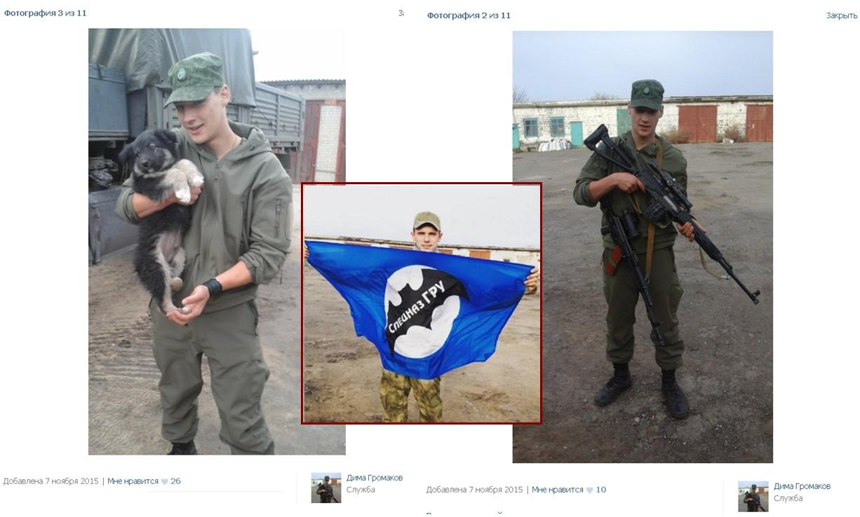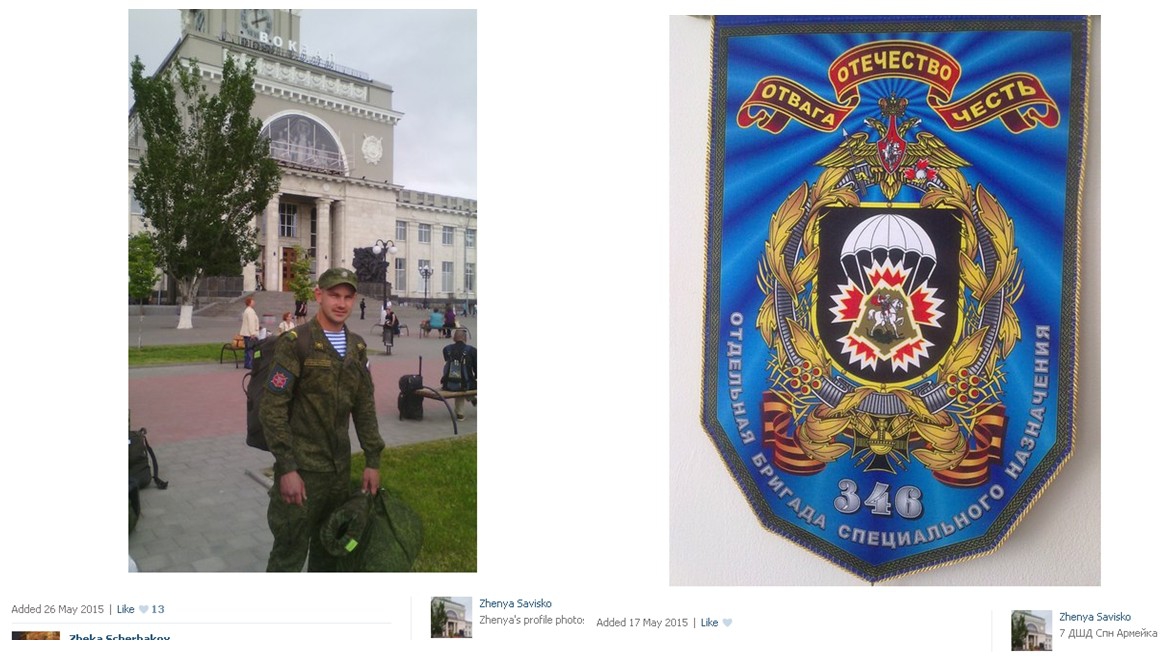 "Further analysis resulted in identification of Zhenya Savisko (archive, photo archive, contacts archive), a friend of Statsuk who served with him. In his blog Savisko poses in an army uniform with the same arm badge as Statsuk in Mozdok. Moreover, there is a photo in his social account's album showing a banner with the 346th Separate Special Forces Brigade's symbols, where both these soldiers serve now.