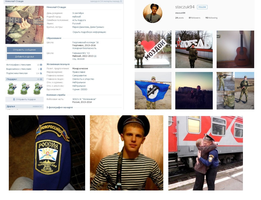 Censor.NET reports referring to an article by InformNapalm volunteer OSINT group."A person named Nikolai Statsuk has come to our attention - Instagram profile (archive), VKontakte profile (archive, album archive, contacts archive). He was born in Maisky (Kabardino-Balkaria, Russia) on Sep. 9, 1994. His compulsory service took place on the naval base in Novorossiysk (military unit No. 90921) and ended in 2014. Statsuk was initially assigned to Zheleznyakov sea minehunting ship but signed a ground service contract afterwards.