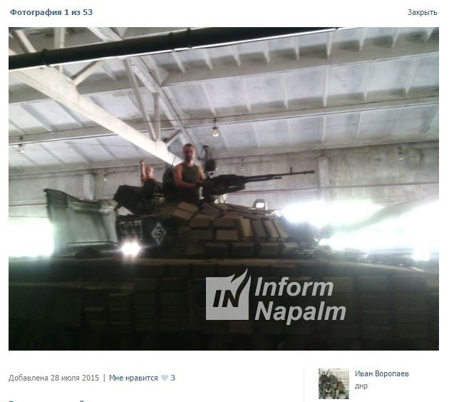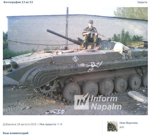 Allegedly since summer 2015 and possibly until now Voropaev has been listed in the 5th brigade of the First Army of the Russian Federation, which is proven by a tactical sign, a diamond with a 5 in the center, painted on the equipment that the coach took images with.