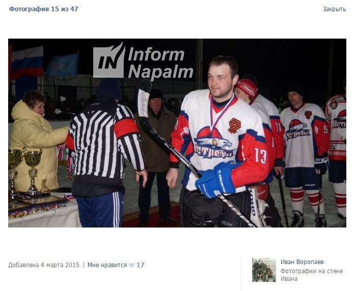 This is reported by international volunteer community InformNapalm, Censor.NET informs.InformNapalm's team has revealed Ivan Voropaev from Tambov city in Russia, who is a hockey player and coach of a youth hockey team and a Donbas terrorist (links to profile, contacts, and photos archives).
