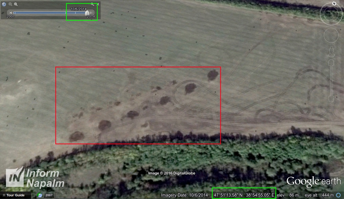 The next image in the history is dated Oct. 6, 2014. It shows burned and trampled down areas of land where pieces had been mounted (large black spots on the shots are signs from firing of rocket systems).