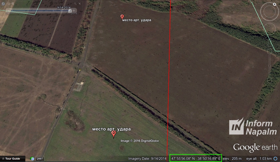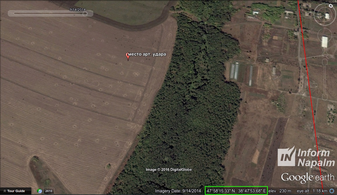 Censor.NET informs citing international volunteer community InformNapalm."In its earlier investigation titled "Google Earth shows redeployment of Russian military equipment to Donbas terrorists" the community revealed facts of equipment redeployment from the Russian territory through uncontrolled section of the Ukrainian border in the area of combat activities. In another investigation, InformNapalm identified the weapons, their shooting directions, routes of ammunition supply, and traces left by shelling. War crimes have no periods of limitation, so we will take a look at border area maps for the time period between September and October 2014, satellite images of which hide numerous interesting details of the fire conducted from the Russian territory upon villages of Marynivka, Pervomaiskyi, Stepanivka and others in August 2014. It's worth noting that these names are also featured in reports by terrorists and propagandists. For instance, a publication with cynical title "Chronology of civil war in Ukraine as of Aug. 15, 2014," posted on Russian website Ruspravda.info, reads: