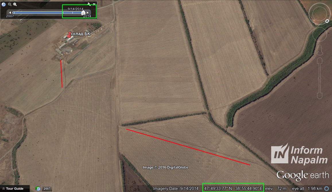 As long as shell craters on the marked spots are seen on images dated Aug. 15, 2014 and are offset to the left from the aiming line, the same as the old battery's position, we can assume that the hits were conducted from the old position. When using artillery, it's important to have ammunition supplied. On the screenshots below, the supply route and a warehouse are marked.