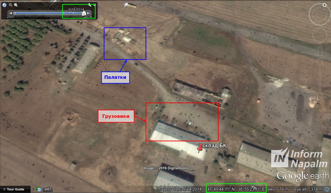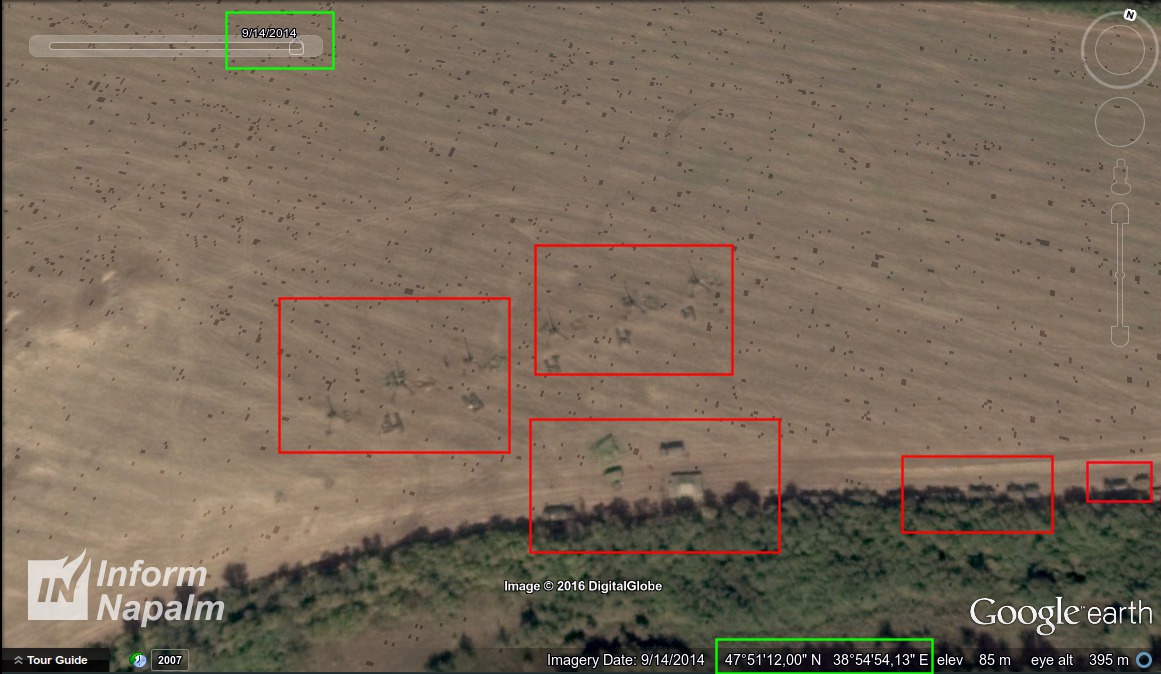 Screenshot of a satellite image dated Sept. 14, 2014. It shows a howitzer battery of six units, ammunition spots, trucks, and a tent. It is located to the east of Primiusskiy village of Kuibyshev district of Rostov oblast. Coordinates and date are marked in green. As long as the length of the gun barrel equals the length of a truck, it can be assumed it's a 152-mm howitzer 2A65 Msta-B. Its gun barrel length is 7,200 mm, while Ural-4230 truck is 7,366-mm long. 122-mm howitzer D-30 has a barrel of 4,660 mm, which would have looked much shorter than the truck on the image.