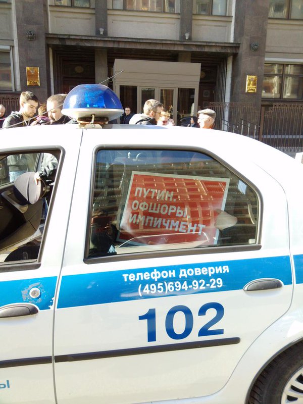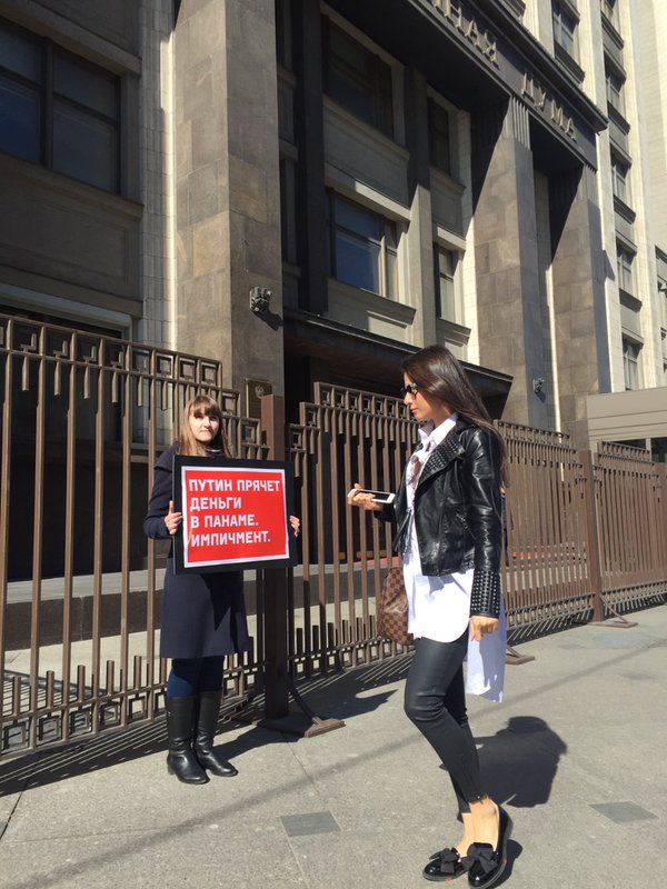 Outside the State Duma building in Moscow, the police detained the participants of one-man pickets, who demanded the impeachment of Russia's President Vladimir Putin over the recent offshore scandal.
