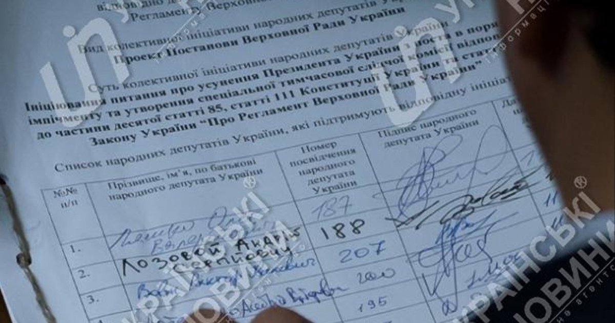 As reported by Censor.NET citing Ukrainski Novyny, a list of signatures has been seen in the box of Samopomich faction in the parliament."The point of the collective initiative of the people's deputies of Ukraine: to initiate the issue of ouster of the president of Ukraine from his post through impeachment and to create a special temporary investigative commission in accordance with part 10 article 85, article 111 of the Constitution of Ukraine and the law of Ukraine "On the procedural rules of the Verkhovna Rada of Ukraine," the document reads.