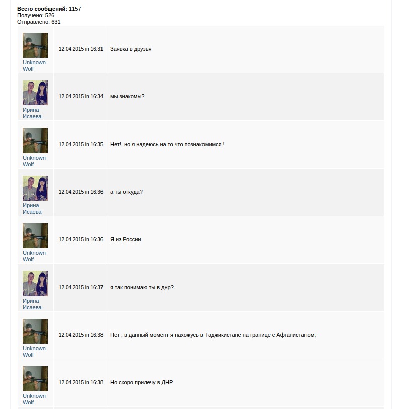 His correspondence with Irina Isaieva (+380639558988, +380997625124) from Krasny Luch in the Luhansk region ( profile, photo album) attests to the following: