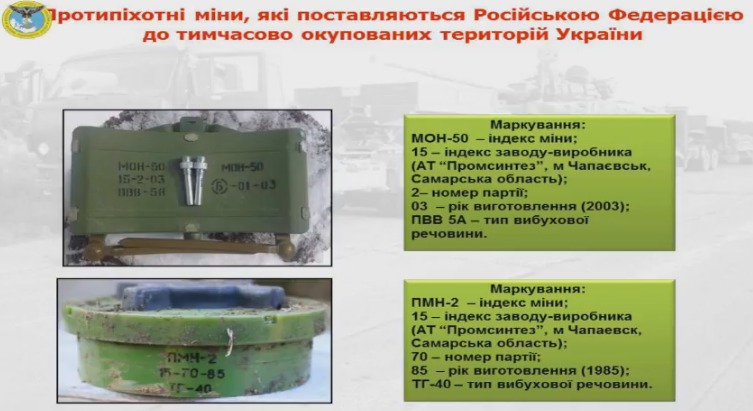 Defense Intelligence spokesperson Vadym Skibitskyi said at a briefing, Censor.NET reports."A particular danger for both anti-terrorist operation (ATO) forces and civilian population is posed by minefields and certain explosive devices planted in temporarily occupied territory. The Russian Federation keeps using banned anti-personnel mines, in particular MON-50 and PMN-2," he said.
