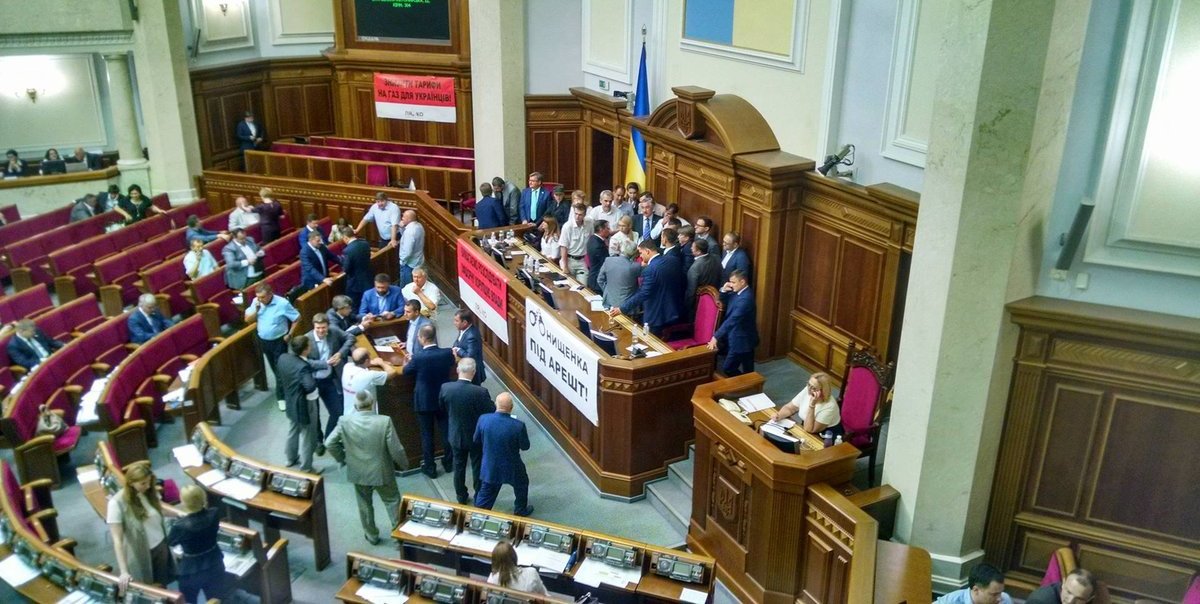 Lawmakers are blocking the rostrum and the presidium of the Verkhovna Rada, a Censor.NET correspondent reports.Oleh Liashko and Yuliia Tymoshenko, the leaders of the blocking parties, can be seen in the presidium.