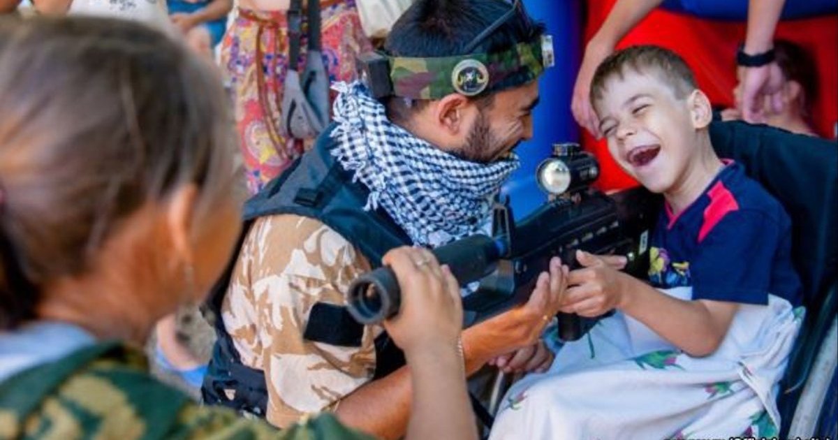 One of the photos, published by the occupation "government" of Sevastopol, shows an armed man giving weapons to a child.