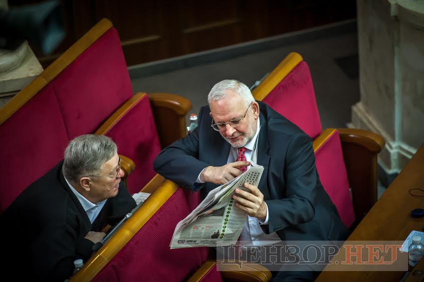Opposition Bloc's Ihor Shurma shows a newspaper to his colleague Vasyl Nimchenko
