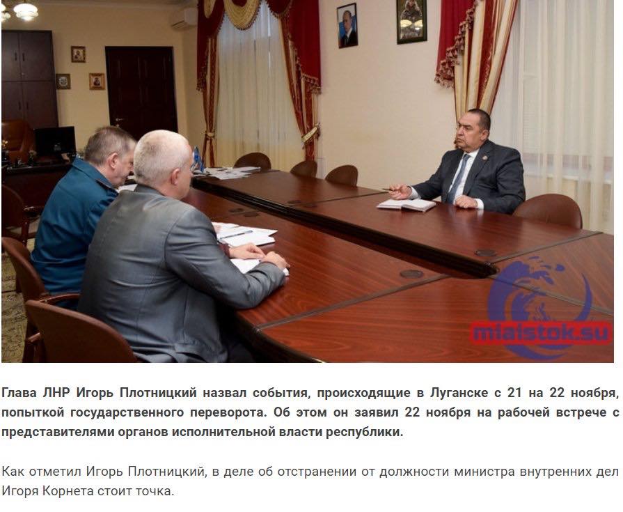 The 'prosecutors' were arrested after sacked 'interior minister' Igor Kornet, who challenged his dismissal, offered 'LPR' terrorists' leader Plotnitsky to hand over the 'prosecutor general,' the 'military prosecutor general,' and their 'deputies' as well as 'LPR secretariat head' Irina Teitsman, 'LPR security service' chief Yevgeny Seliverstov and head of the 'LPR State Broadcasting Company' Anastasia Shurkaeva. Plotnitsky refused to hand these persons over despite Kornet's allegations that these individuals were involved in subversive activities and espionage in favor of Ukraine.