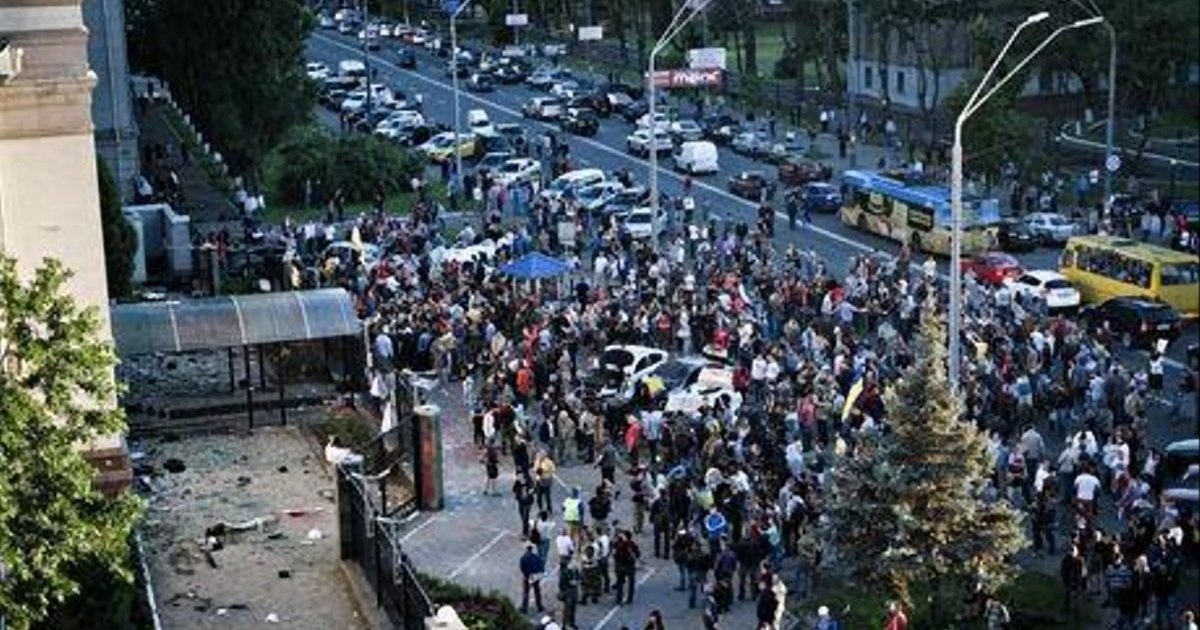 Andriy Deshchytsia, the country's acting foreign minister, arrived at the Russian embassy to reason with crowds who had gathered outside, angered that pro-Russia rebels had brought down a Ukrainian transport plane near Luhansk early on Saturday, killing 49 people on board. The crowds threw rocks and eggs at the embassy, destroyed diplomatic vehicles, and painted swastikas on the gates, chanting "Putin is a fascist" and "Putin khuilo".