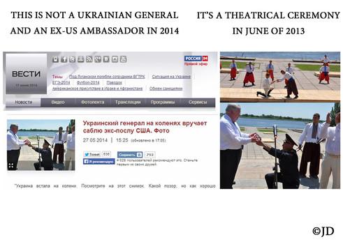 13. Numerous Russian mainstream media outlets have falsely claimed that a General of the Ukrainian military got on his knees in front of a former Ambassador from the U.S. in May of 2014. Russian media claimed that such an action demonstrated the subservience of the Ukrainian military to the United States of America.