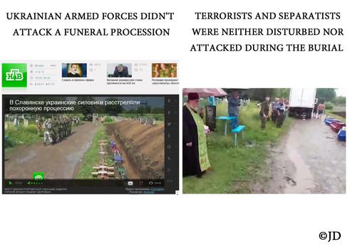 7. Russian media, including NTV television program, alleged that members of the Ukrainian military attacked a funeral procession by the separatists. In fact, separatists themselves fired the shots into the air, but were not attacked by the military. This is apparent from the following video of the funeral.