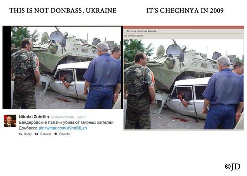 20. A photograph that was represented to depict the alleged brutality of the Ukrainian military against the civilians of Donbass, Ukraine in 2014 was actually a photo from Chechnya, taken in 2009.