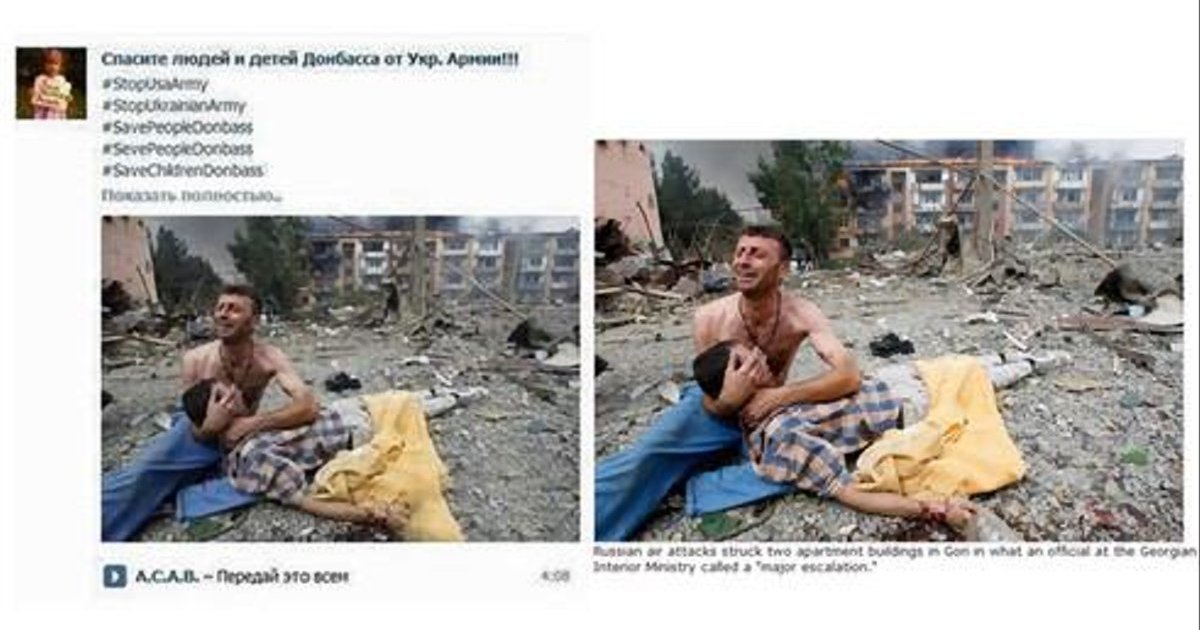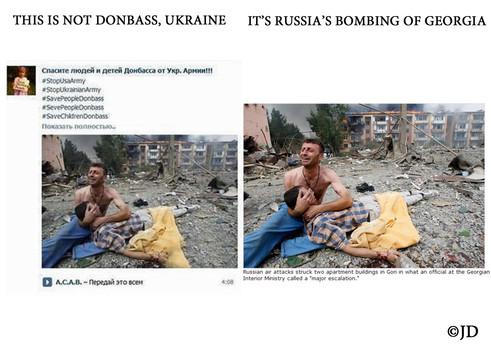 15. Photograph of Russia's bombing of civilian populations in Georgia was represented as a depiction of the alleged bombing by the Ukrainian military in Donbass, Ukraine.