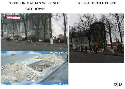 10. Russia's Channel One and other prominent mainstream media falsely claimed that the Ukrainian government ordered the removal of trees from the Maidan, in an attempt to destroy the evidence related to the direction from which the snipers fired on the crowd of protesters. Local blogger from Kyiv conducted an independent investigation, refuting these false claims with photographs and video.