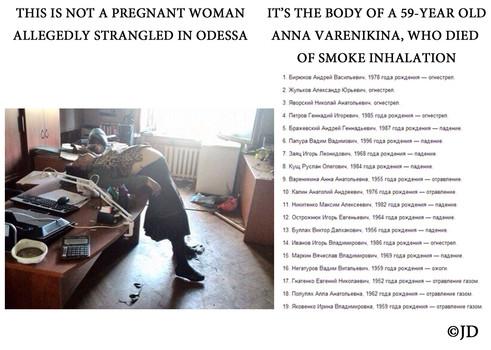 4. One of the victims of the tragic events in Odessa was falsely represented by the Russian media to have been a pregnant woman, strangled with a cord. In reality, the victim, Anna Varenikina, was a 59 year old woman, who died from the combination of thermal damage, smoke inhalation and related poisoning.