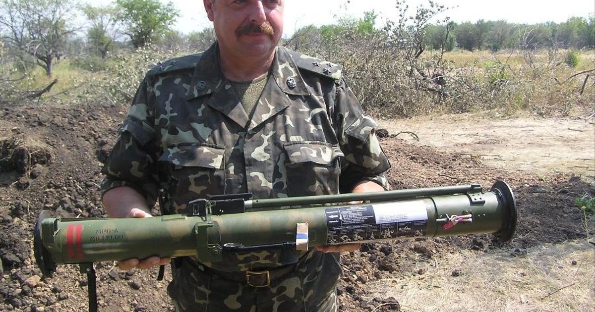 Military engineer colonel Mykhailo Kovalskyi shows Russian-made Shmel flamethrower that had been seized by soldiers of the 51st brigade in Kostiantynivka.