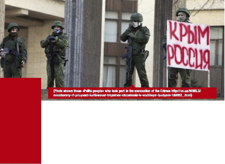 At the same time in the Crimea self-defense units were formed. 27 February, 2014, Russian special operations forces under the guise of "self-Russian-speaking population of Crimea" captured administrative buildings in Simferopol.