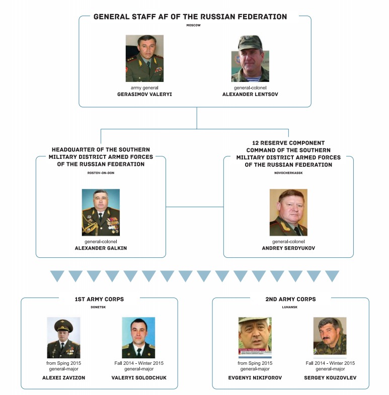 General management and coordination of the combat missions, the weapons supply, military personnel placement and contractors of the Russian Federation on the temporarily occupied territory of Luhansk and Donetsk region and the annexed Crimea were made by the General Staff of 12 Reserve Component command of the Southern Military District of the Armed Forces of the Russian Federation. 12 Command has been temporarily relocated from Novocherkassk to Rostov-on-Don in 2014.