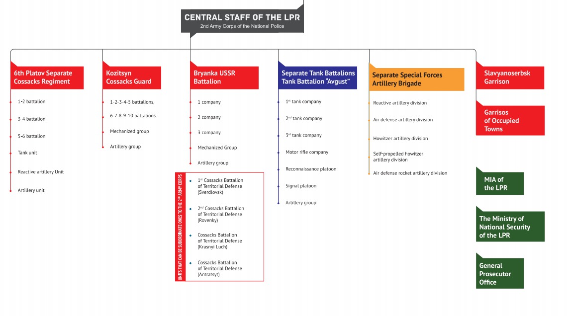 Initially, Russian media provided coverage claiming as though terrorists' groups consist of local population only. Russian citizens and local separatists joining them formed a backbone of the first organized "LPR" units. Unit's structures bore resemblance with military: military ranks, positions, companies, equipment supply, etc. Each illegal armed group had its own responsibility area, own base and controlled territory. Often towns were split into controlled zones - the more powerful and bigger a group was, the larger territory it had under its cover. Each group required financing, food and various supplies, therefore in social networks, on the streets of occupied Ukrainian and Russian towns there was organized fundraising for such groups.[15]