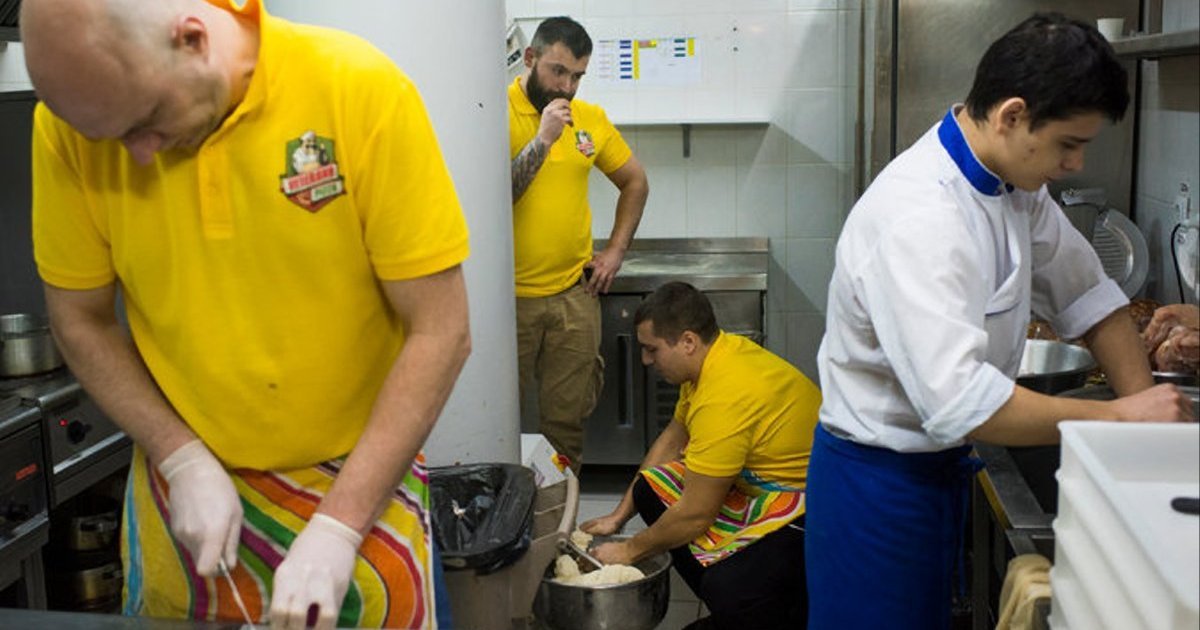 Leonid Ostaltsev, second from left, is the founder of Pizza Veterano, a new pizzeria in Kiev that hires only veterans of the war in eastern Ukraine as cooks. CreditPete Kiehart for The New York Times