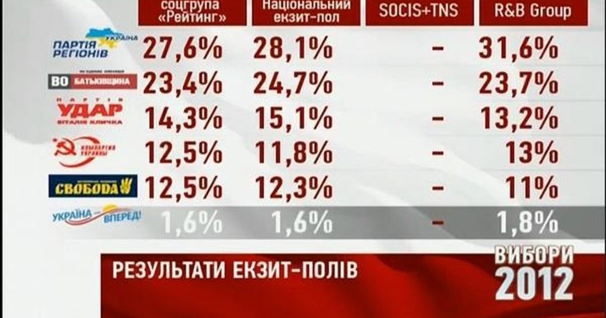According to National Exit Polls, conducted by TNS and SOCIS, the Party of Regions takes the first place.