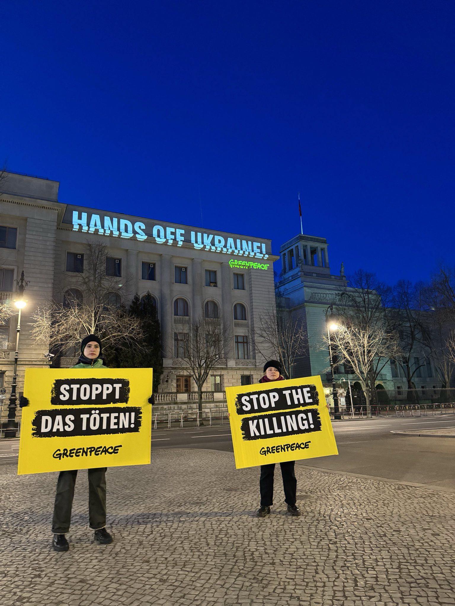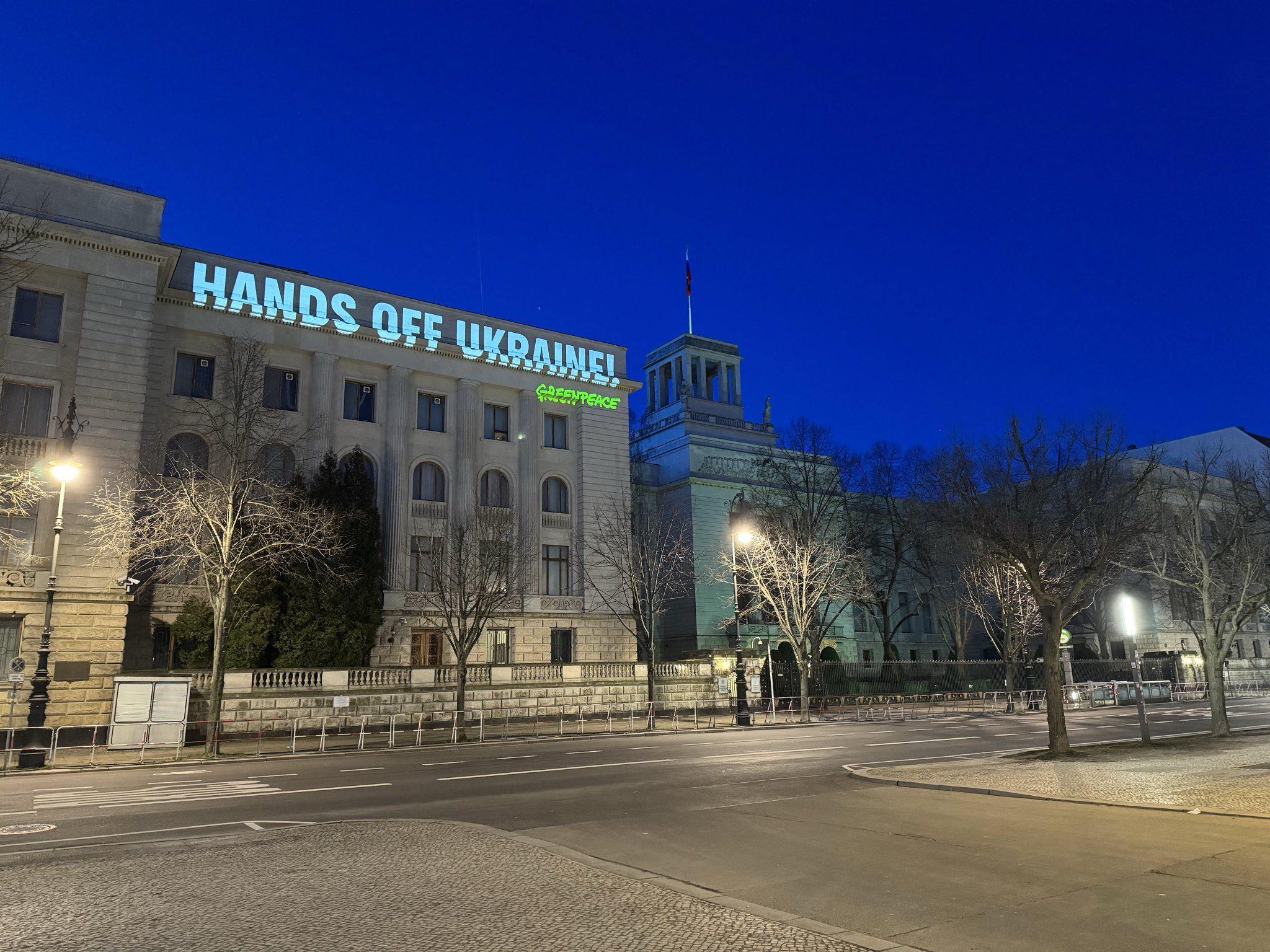 This morning, Greenpeace activists projected the words "Stop the killing" and "Hands off Ukraine" on the building of the Russian Embassy in Berlin.