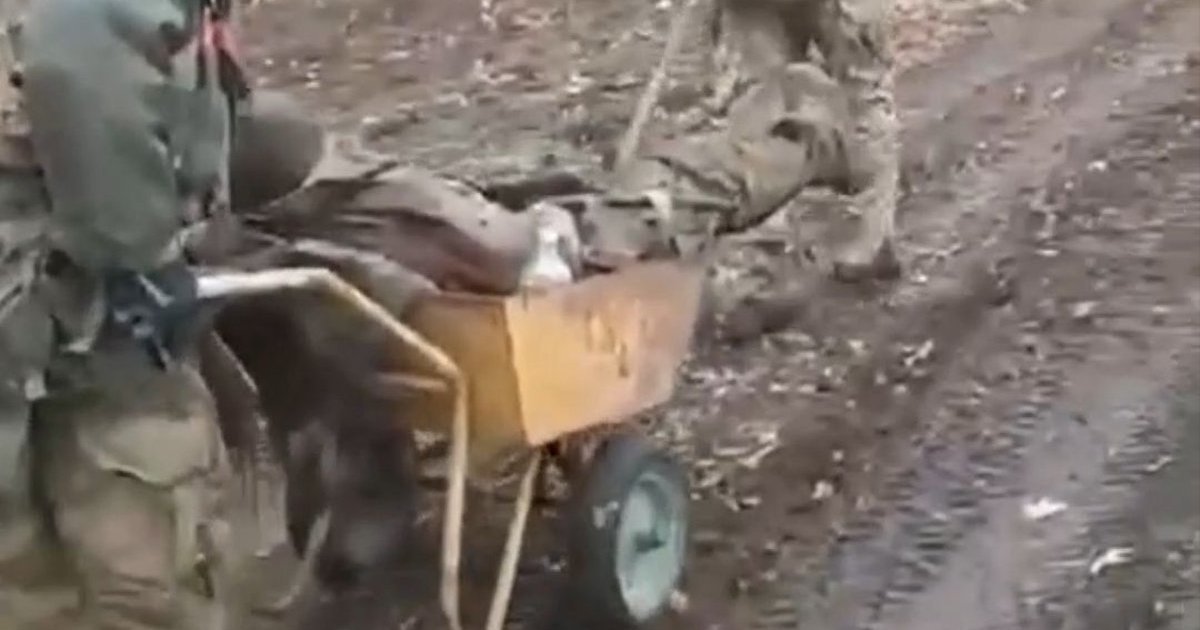 Occupiers haul their dead assault trooper in wheelbarrow on Vovchansk axis. VIDEO