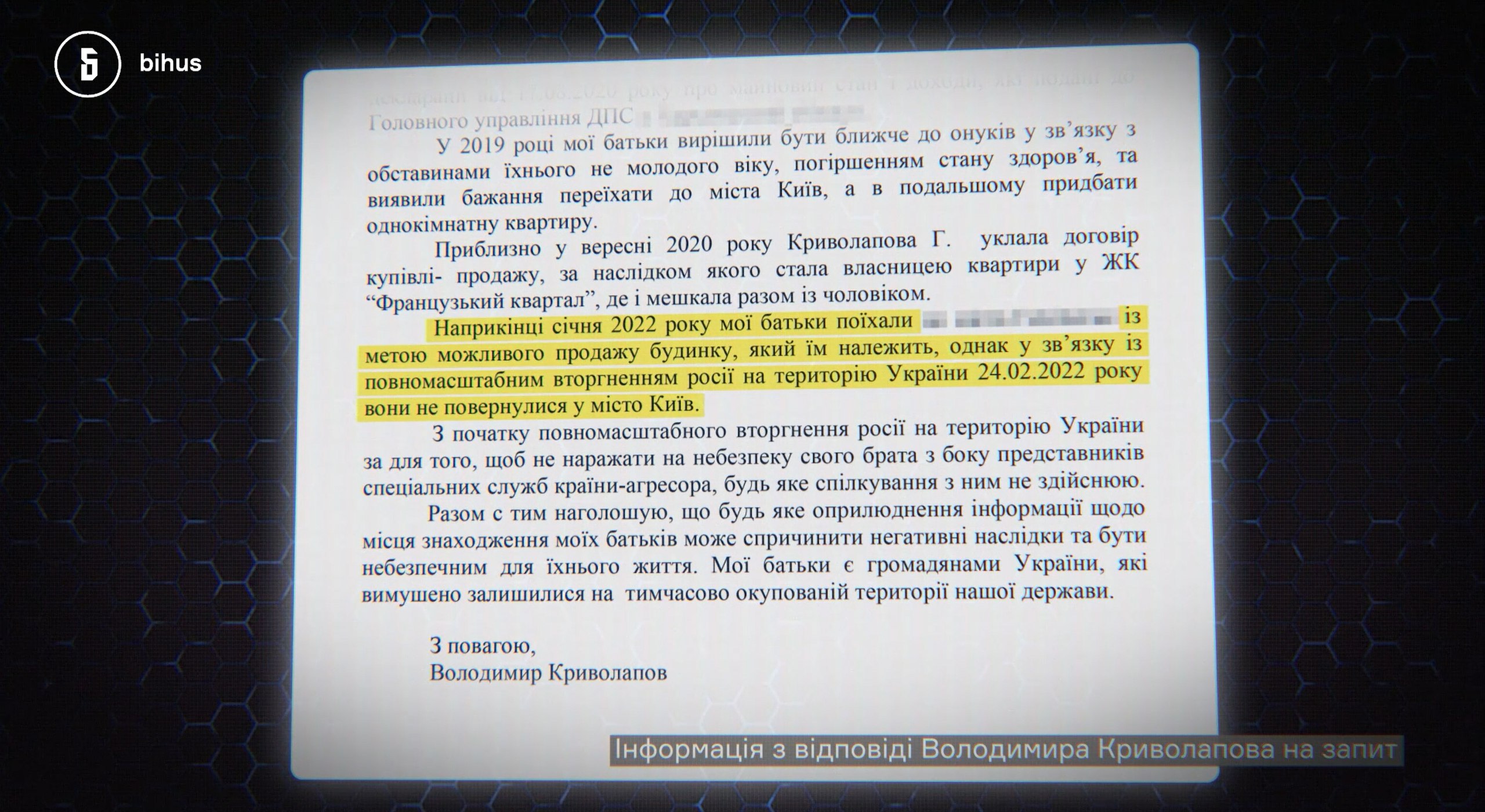 Bihus.Info suggests that these circumstances may pose significant risks to the security of the area Kryvolapov oversees in the Cyber Police, since the presence of a Ukrainian law enforcement officer’s family in Russia and in Russian-occupied territory creates potential leverage over him.