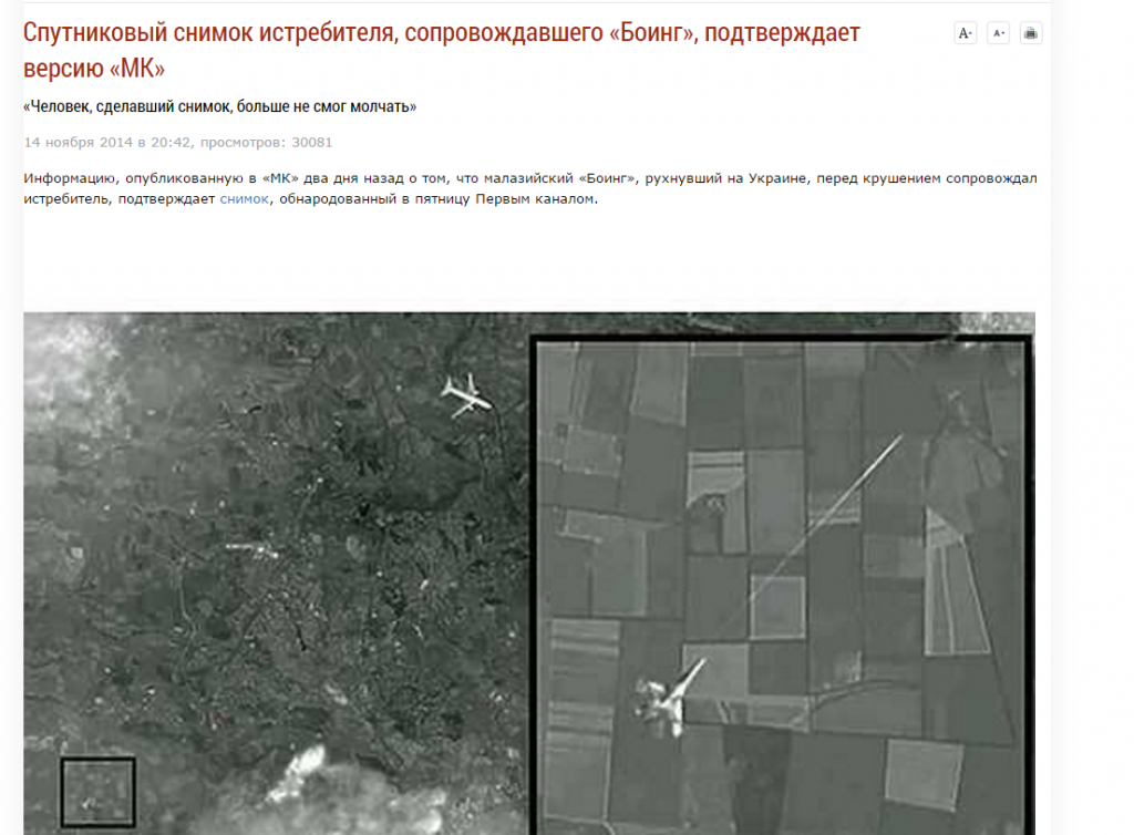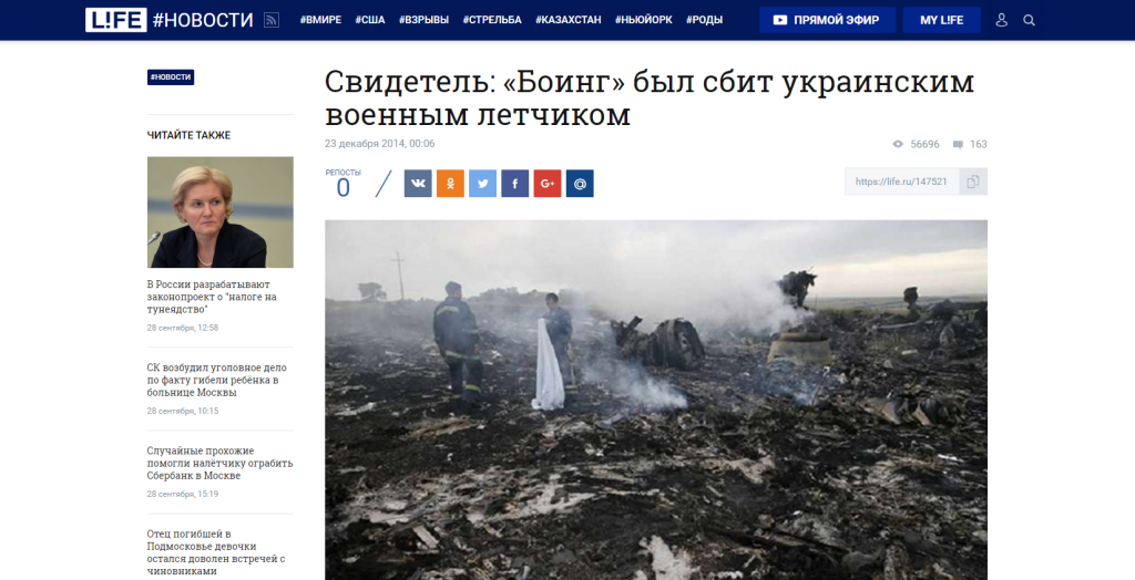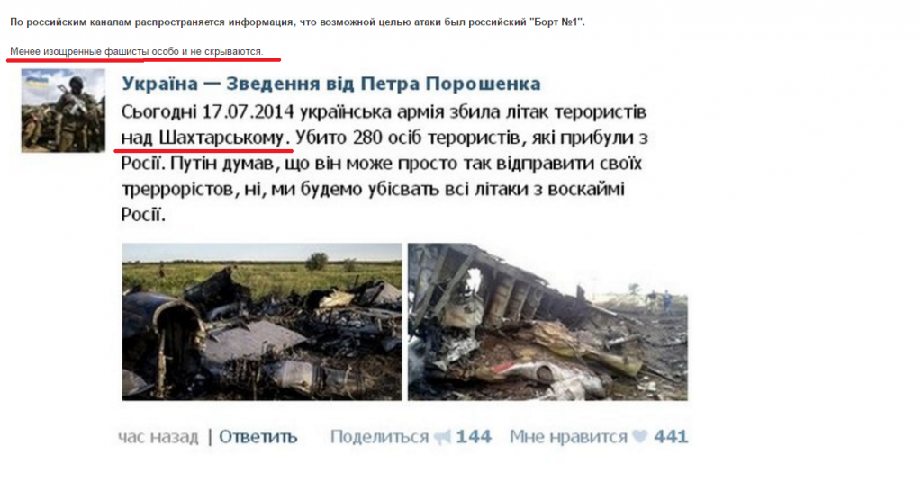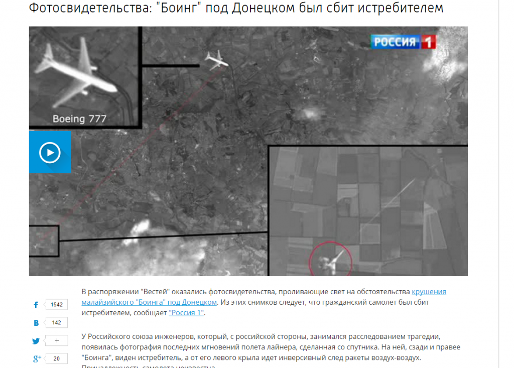 Kazanskyi posted a set of print screens of fake 'news stories' from Russian media about the MH17 having been shot by a Ukrainian jet (with 'interviews' of 'witnesses' and 'images' from 'radars'). The journalist calls to create an 'online museum' of Russian MH17 fakes before they are taken down from the websites.