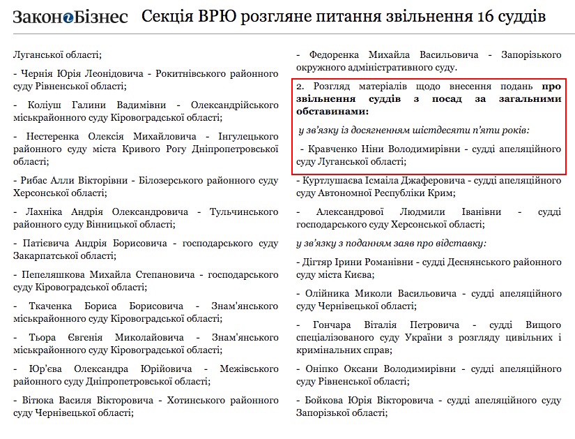 Например, 1 февраля секция Высшей рады юстиции Украины рассмотрит вопрос об увольнении в связи с достижением 65-летия судьи апелляционного суда Луганской области Кравченко Нины Владимировны.