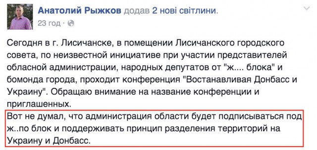 Руководитель лисичанской юридической фирмы Анталий Рыжков заметил, что само по себе название конференции содержит сепаратистский месседж.