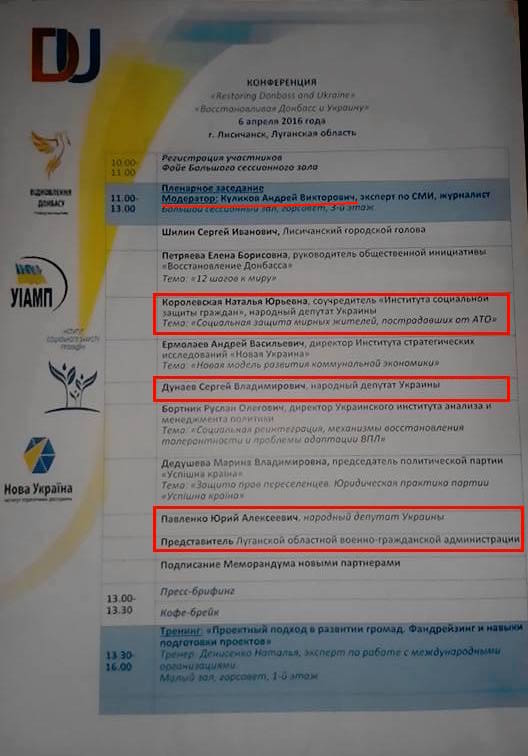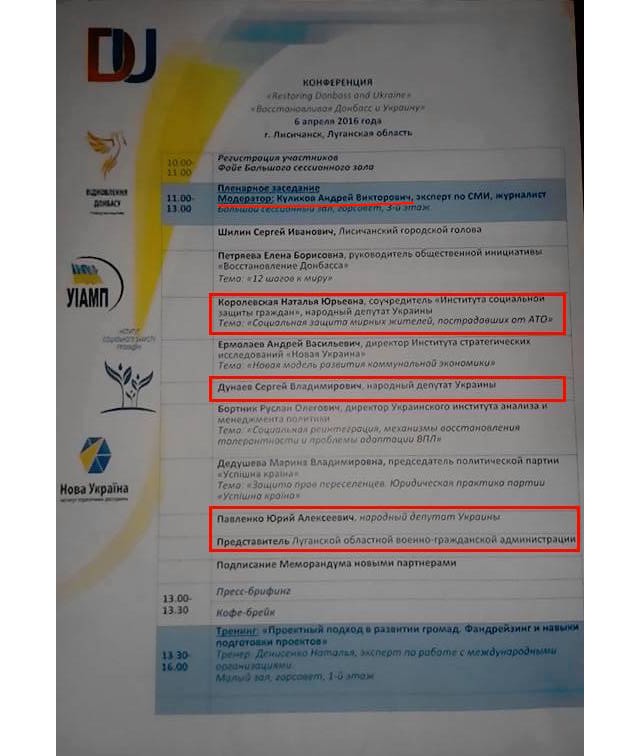 Вернемся к мероприятию. Оно носило название "Конференция "Восстанавливая Донбасс и Украину". Его модератором был заявлен телеведущий Андрей Куликов, которому, похоже, стало окончательно плевать, на кого работать. Среди участников значились Сергей Шилин, Лисичанский городской голова, Сергей Дунаев, голова Лисичанского городского головы и народный депутат от "Оппозиционного блока", Наталья Королевская, народный депутат от "Оппозиционного блока", Юрий Павленко, народный депутат от "Оппозиционного блока".