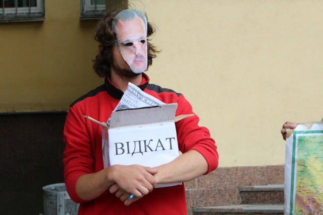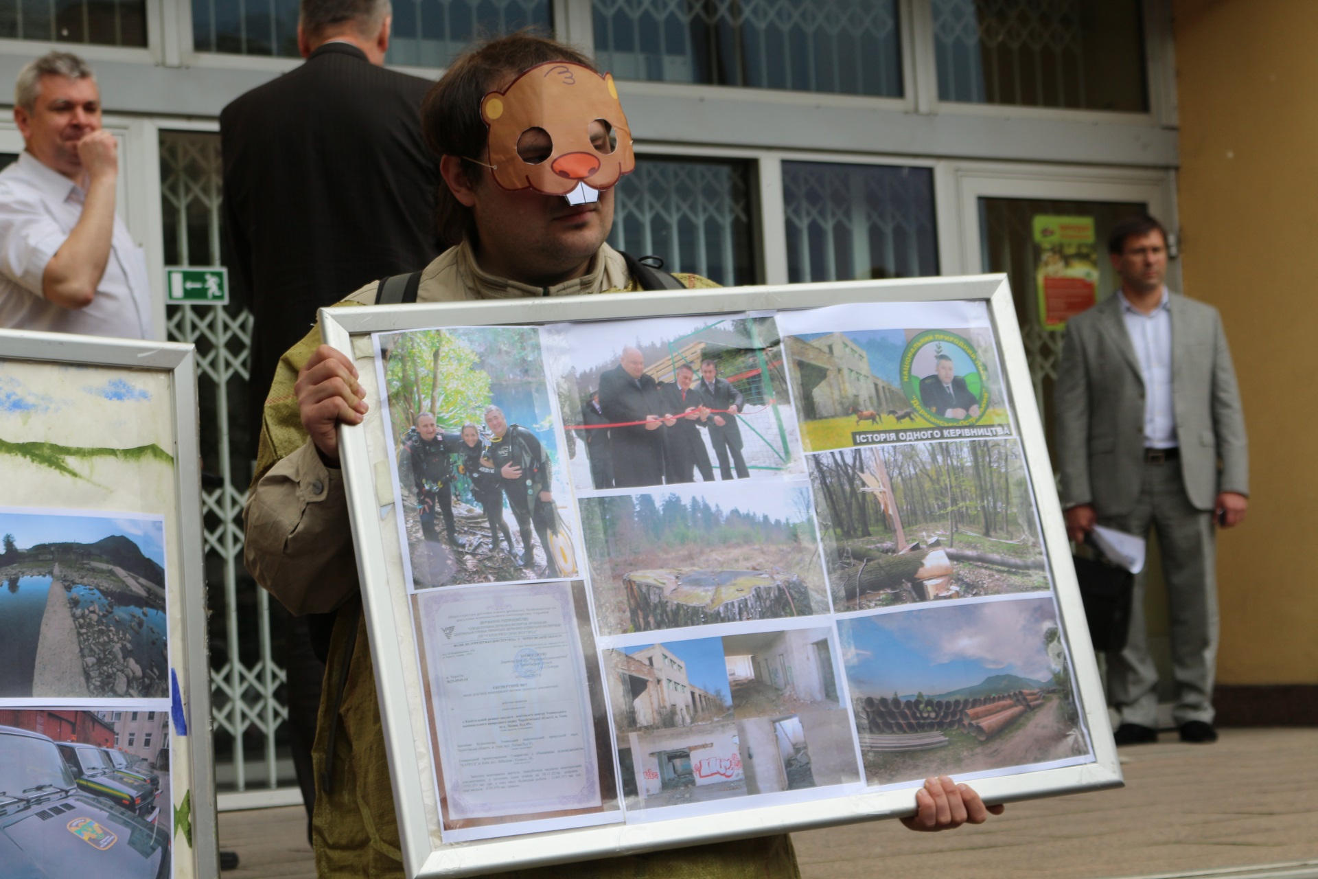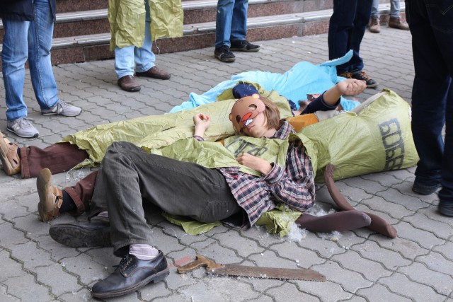 Сьогодні під будівлею Мінекології відбулася акція-перфоманс, на якій активісти показали як при отримані «бабла» «Віктор Канцурак» завзято та весело страчує та знищує звірів, птахів та риб - мешканців заповідних територій з використанням тендерів та відкатів. Страта відбувалась на імпровізованому ешафоті.