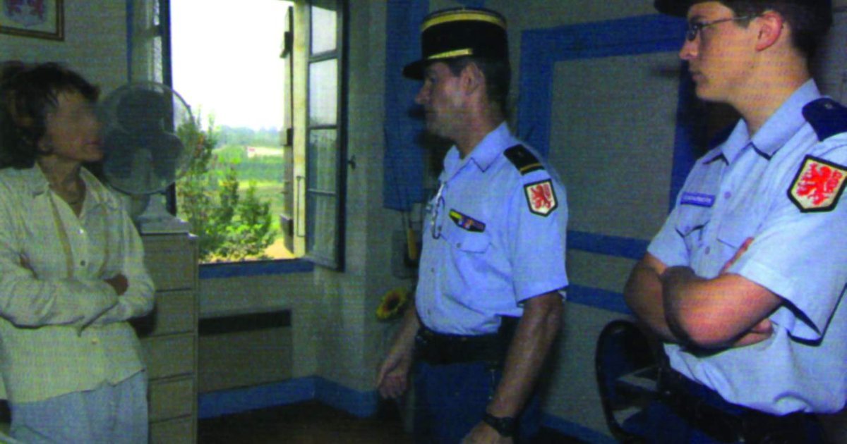 Представники двох поколінь резервістів Національної жандармерії Франції - ветеран у званні «аджюдан», що приблизно відповідає українському званню «прапорщик» (у центрі) та його юний колега у званні «помічник жандарма» проводять бесіду бесіду із жителькою сільської місцевості у департаменті Жерс у ході операції «Превентивний контакт», спрямованої на запобігання злочинності.
